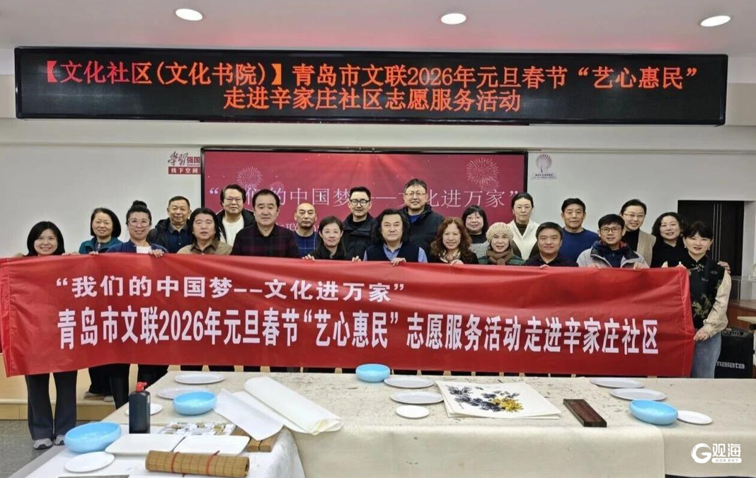 在珠海路街道辛家庄社区,岛城艺术家们凝神挥毫,遒劲有力的书法、栩栩如生的花鸟跃然纸上,让社区居民们感受到中华传统书画的独特魅力。青岛市文联2026年元旦春节“艺心惠民”走进辛家庄社区志愿服务活动在此温情启幕。社区的老年书画爱好者围在一旁观摩交流,社区燕儿岛路幼儿园的孩子们更是满眼好奇,在艺术家的耐心指导下握起毛笔,一笔一画描摹童趣。老幼两代人同研墨、共挥毫,让古老的书画艺术在老少接力中焕发新生。