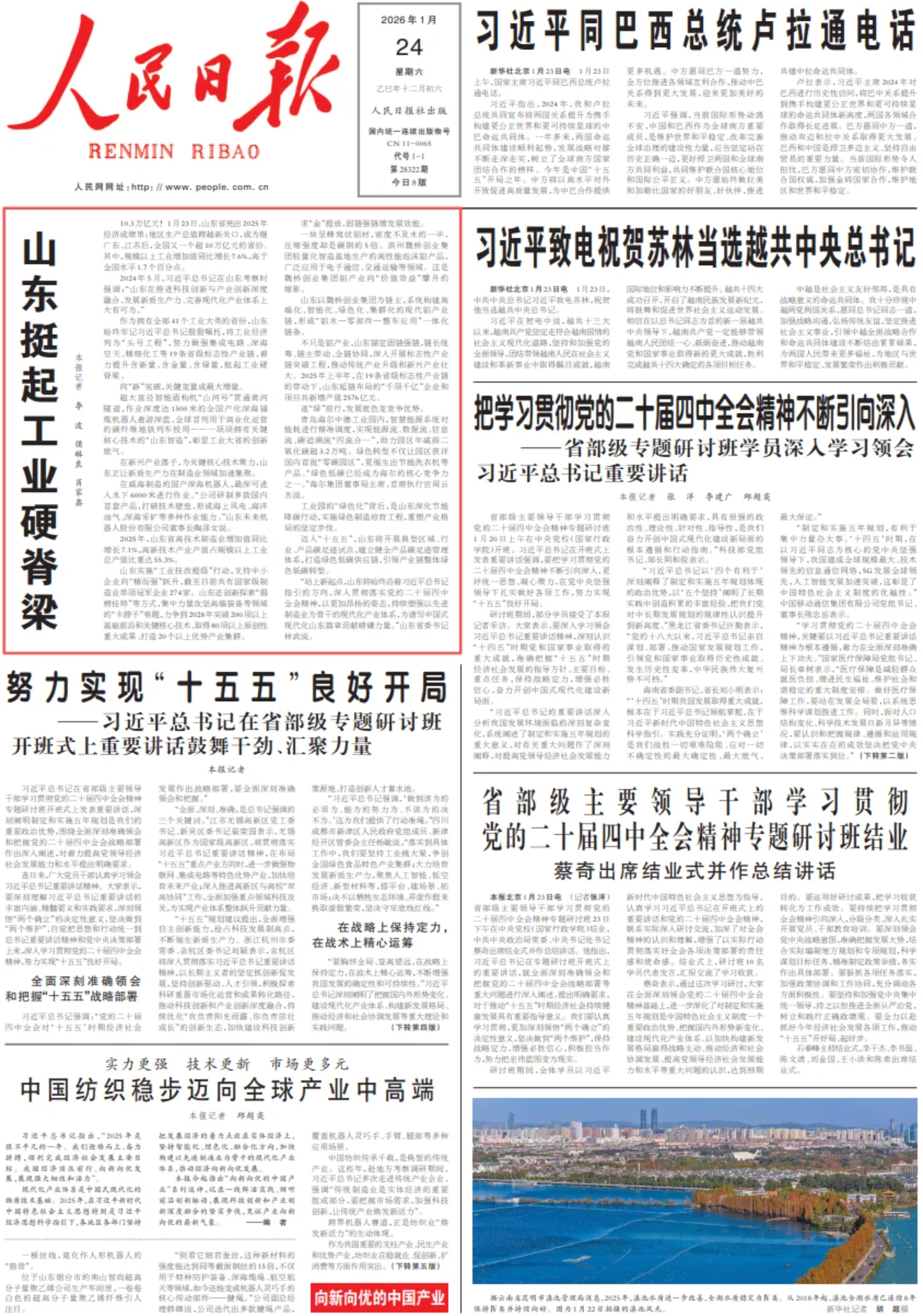 1月24日,《人民日报》头版头条以《山东挺起工业硬脊梁》为题,聚焦山东。文章指出,作为拥有全部41个工业大类的省份,山东始终牢记习近平总书记殷殷嘱托,将工业经济列为“头号工程”,努力做强集成电路、深海空天、精细化工等19条省级标志性产业链,着力提升含新量、含金量、含绿量,挺起工业硬脊梁。