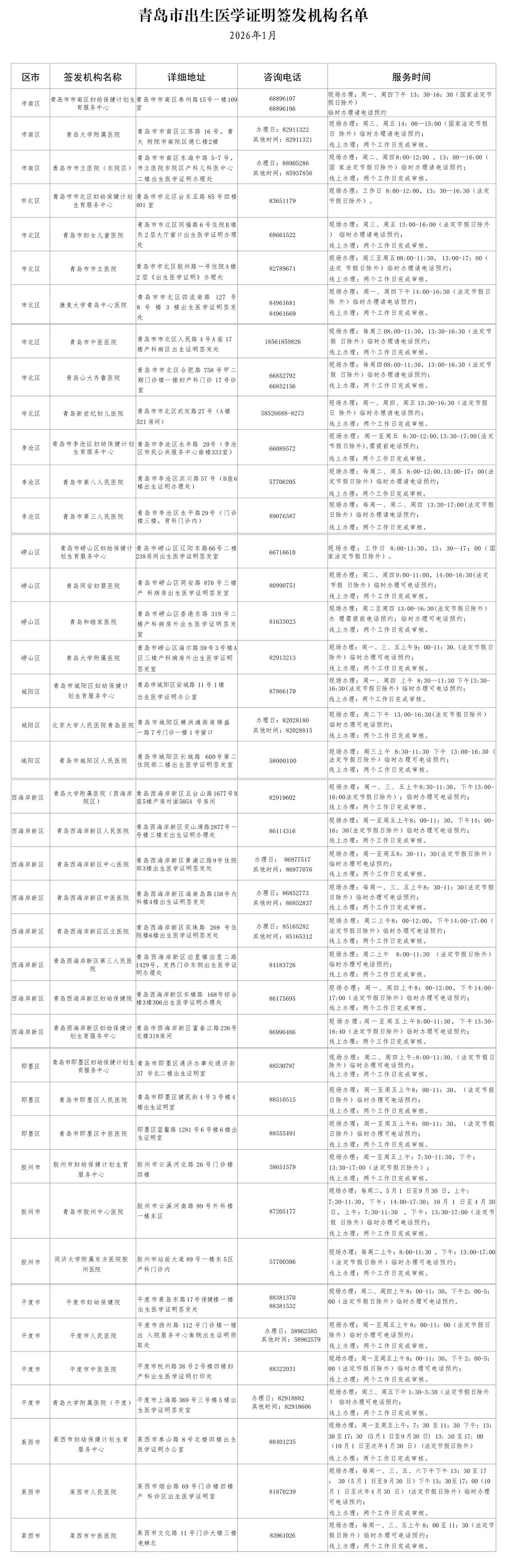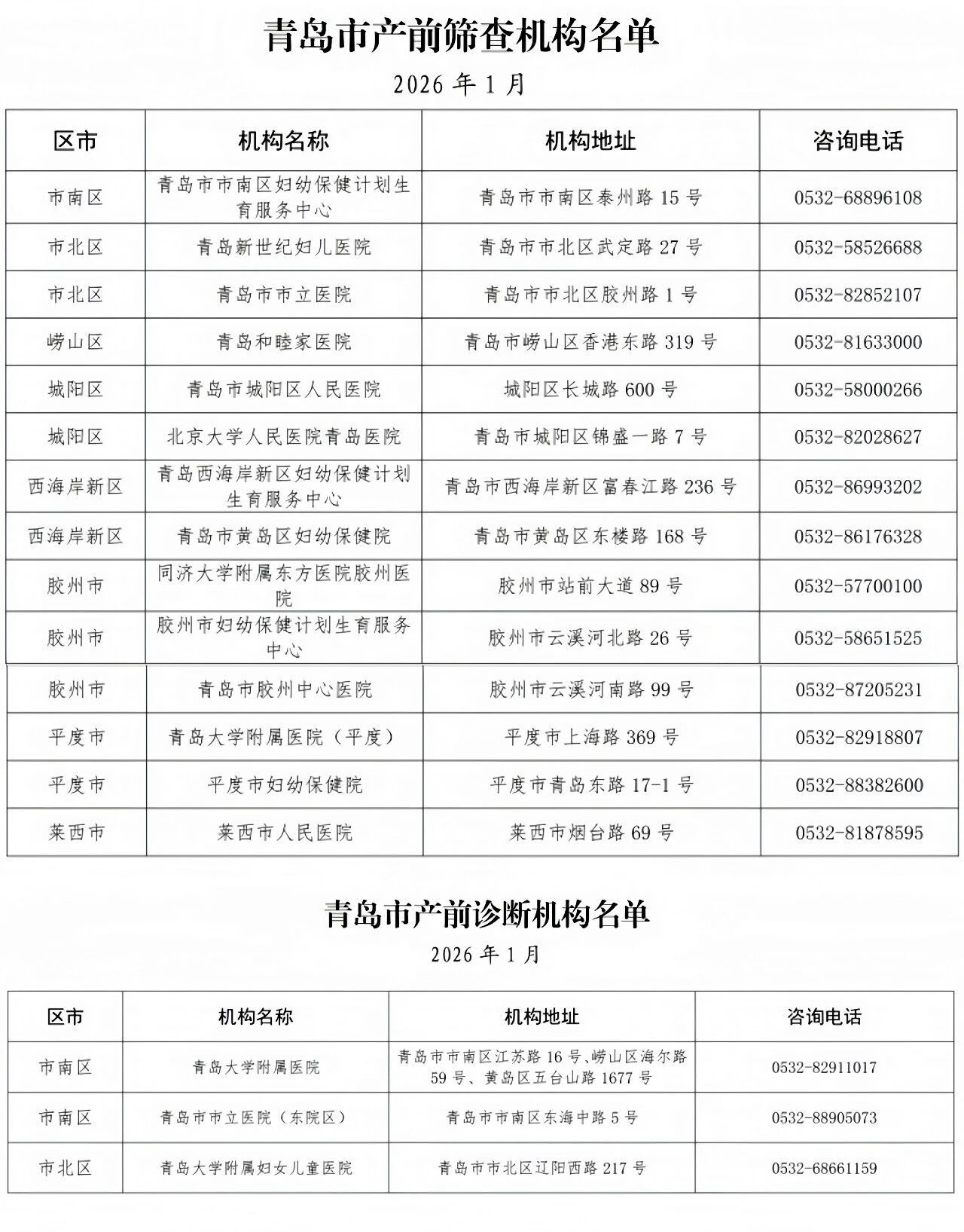 @青岛人,事关生娃,这些名单收藏好! 2026-02-06 09:00 青岛卫生健康 我要评论0 字号: 青岛市出生医学证明签发、委托管理机构名单 青岛市助产机构名单 青岛市产前筛查、产前诊断机构名单 责任编辑:王逸群 微笑 流汗 难过 羡慕 愤怒 流泪 复制网址 打印 收藏 分享到: 0