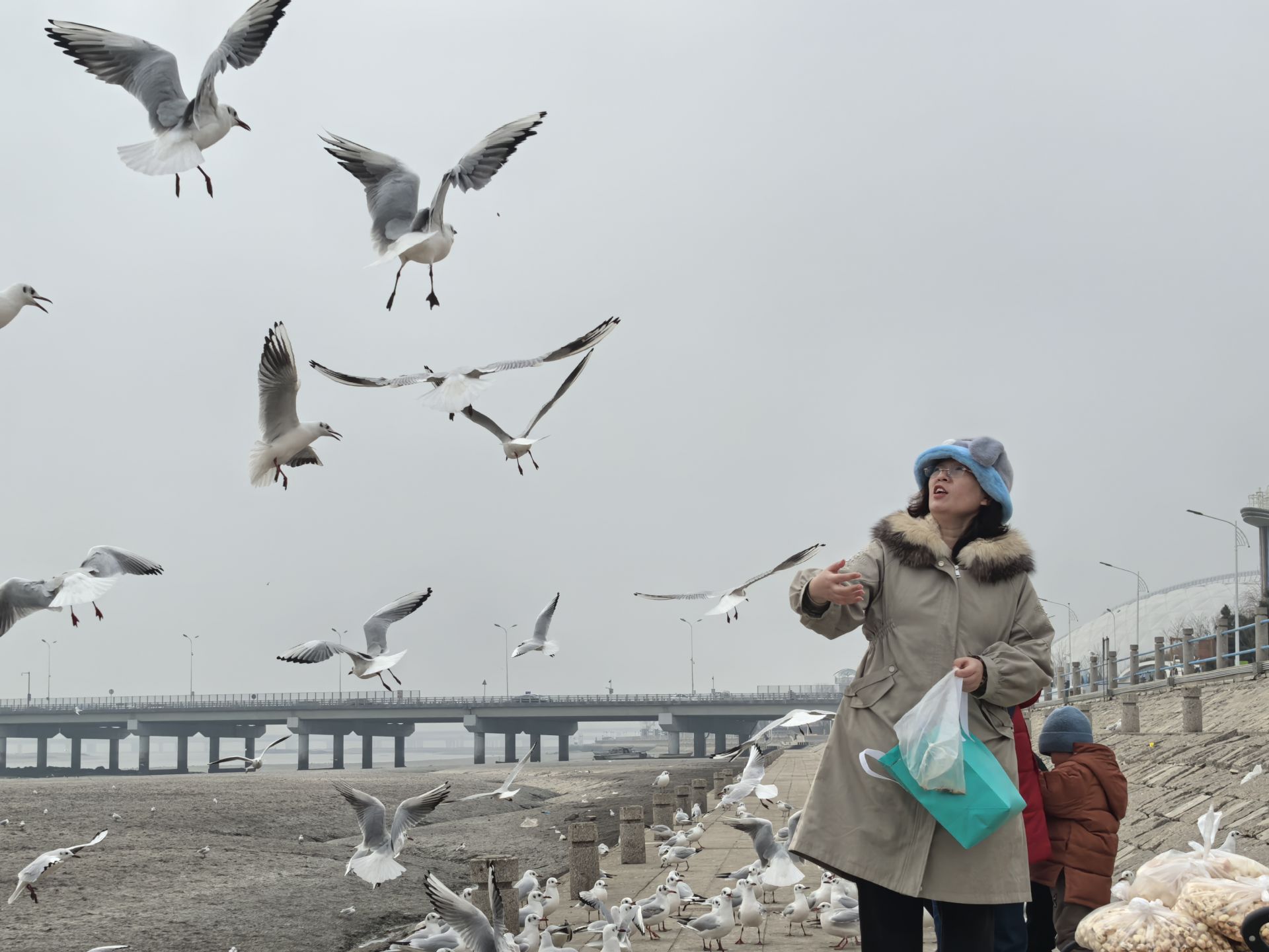 暖阳下的观鸥汀视野开阔,白色的海鸥成群掠过水面,构成一幅动人的自然画卷。现场不少市民游客手持提前备好的面包碎,细心掰碎后投喂海鸥,聪慧的海鸥或跟随举食的手低空飞行,或有序等候投喂,偶尔觅食后还会盘旋飞舞,憨萌的模样惹得众人笑意连连。“看着海鸥围着自己飞,心里特别治愈,过年期间来这儿走走,感觉特别放松。”前来打卡的市民说道。