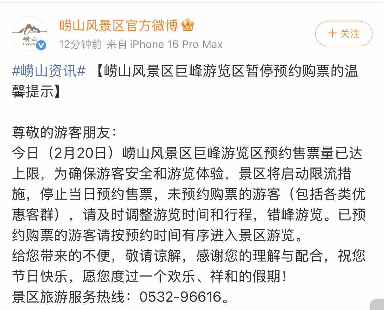 青岛日报社/观海新闻2月20日讯 20日上午,观海新闻记者从崂山风景区获悉,今日(2月20日)崂山风景区巨峰游览区预约售票量已达上限,为确保游客安全和游览体验,景区将启动限流措施,停止当日预约售票,未预约购票的游客(包括各类优惠客群),请及时调整游览时间和行程,错峰游览。已预约购票的游客请按预约时间有序进入景区游览。(青岛日报/观海新闻记者 衣涛)