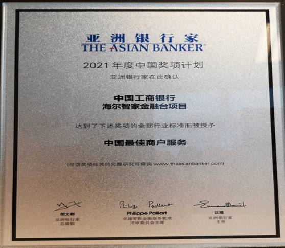 紧盯“一号工程”,助力“世界工业互联网之都”建设。青岛工行以总行与海尔集团签订《战略合作协议》为契机,全面启动与海尔合作事项的“一号工程”,发挥工行在科技、服务等方面优势,深度融入卡奥斯工业互联网平台建设,以“融智+融资+融商”的一体化综合化金融服务,共同打造“工业互联网+金融”新生态。2021年7月,“海尔智家金融台”项目荣获《亚洲银行家》“中国最佳商户服务”大奖。